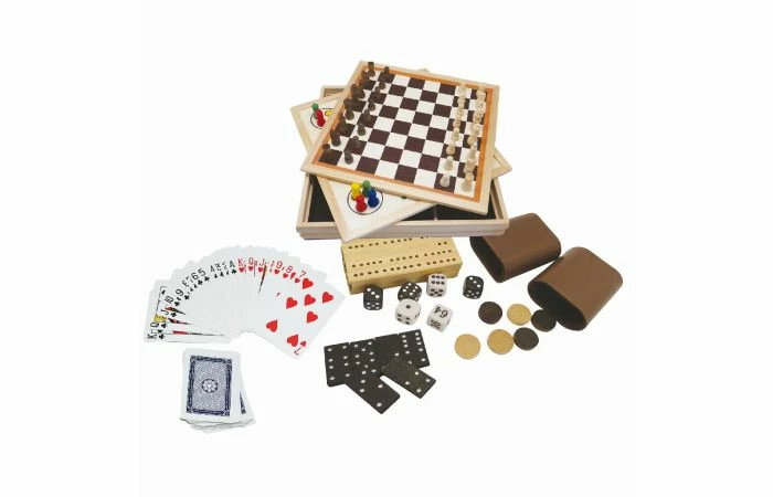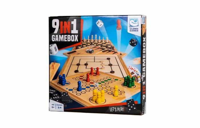 Clown Games 9-in-1 spellendoos van hout. Deze set bevat 9 spellen: schaken, dammen, backgammon, domino, ludo, dobbelspel, Cribbage, Morris en speelkaarten. Dit is echt een super-complete set! Je kunt alle spelonderdelen opruimen in een handige opbergdoos met vakken, voorzien van een vilten onderkant. Dit spel is geschikt voor zowel kinderen als volwassenen: 2 tot 4 spelers vanaf 6 jaar.