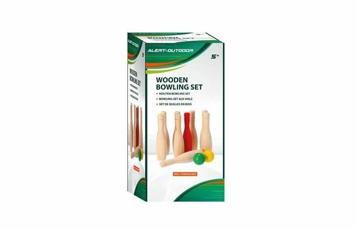 Bowling set outdoor hout. Deze houten bowling set bevat 9 kegels, 2 ballen en een opbergnet. Geschikt voor kinderen vanaf 5 jaar oud.