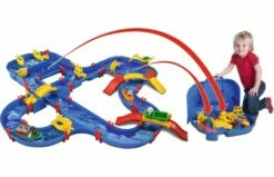 Amphie World is een van onze grootste systemen en maakt het mogelijk dat veel kinderen samen spelen. Door het draaien van het schoepenrad, beweegt het water de voertuigen door de kanalen, een ideale reis wanneer je alle fun play stations wilt bezoeken! Het vrachtschip kan worden aangemeerd aan het talud in de jachthaven, terwijl het containerschip de sluis passeert. Dit wordt gemakkelijk geregeld met behulp van de pomp en het openen van de sluisdeuren. In de grote haven kan de kraan u helpen om de container op de amfibietruck te laden. Laat de truck verder de set in rijden door gebruik te maken van het brugsysteem of het water in glijden, waar hij functioneert als boot. De navigatie in de kanalen wordt natuurlijk uitgevoerd door de zeer capabele poppetjes, de Beer Bo, Wilma het Nijlpaard, Lotta de Eend en Nils de Kikker. Deze set heeft een extra functie; hij is deels een draagbaar kanaalsysteem. U kunt eenvoudi g twee boxhelften losmaken en ze samenklappen als een koffer. Dit laat kinderen zowel plezier hebben in de tuin, als het meenemen naar vrienden of op vakantie. Dit is een creatieve en speelse manier om ze te leren hoe het water beweegt, optilt en stijgt!
