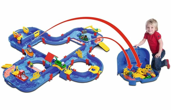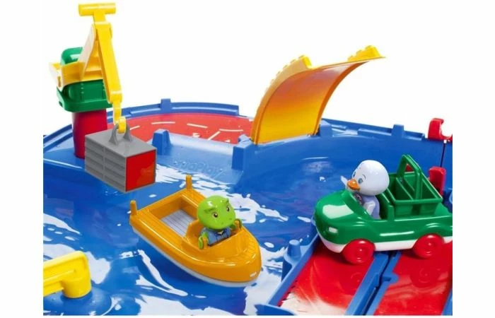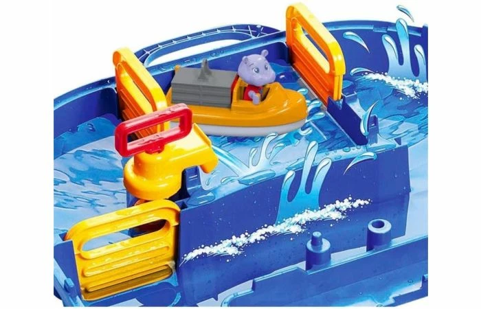 Welkom bij het grootste avontuur van Aquaplay! Dit luxe systeem is Aquaplay’s grootste en bevat de meeste van onze spelfuncties. De populaire sluis is natuurlijk een van de belangrijkste attracties – laat Wilma het Nijlpaard de containerboot nemen voor een excursie door het sluizensysteem heen. Je regelt het waterpeil met behulp van de pomp en door de sluisdeuren te openen. De boot zal al snel weer in de kanalen zijn om zijn tocht voort te zetten! De veerboot heeft zijn eigen plek bij het veerstation. Hier is de ideale plek om de amfibietruck op te pikken als die zijn lading op het land heeft bijeengekregen. De amfibietruck, gereden door de Eend Lotta, heeft ook de mogelijkheid om af te dalen in het water en te fungeren als boot. Aan de overkant van de set is de haven gelegen. Hier kunt u Bo de Beer en Nils de Kikker de container laten laden op het vrachtschip met behulp van de kraan. Door aan het rad met peddels te draaien, beweegt het water de voertuigen steeds maar rond door de kanalen. Deze manier van spelen stimuleert de creativiteit en verbeelding van kinderen, een speelse manier om ze te leren hoe het water beweegt! Deze set heeft een extra functie; hij is deels een draagbaar kanaalsysteem. U kunt eenvoudig twee boxhelften losmaken en ze samenklappen als een koffer. Dit laat kinderen zowel ple zier hebben in de tuin, als het meenemen naar vrienden of op vakantie. Artikelgrootte na in elkaar zetten: 160x145x22 cm.