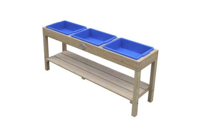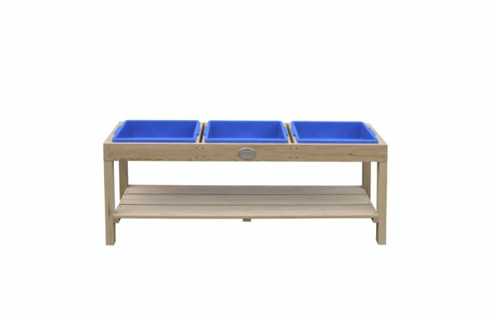 - Drie uitneembare blauwe kunststofbakken voor zand of water.