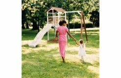 Via de trap kunnen ze omhoog de toren in klimmen. Vanaf daar hebben ze een prachtig uitzicht over de hele tuin. Tijd om weer naar beneden te gaan? Dan glijden ze snel en gemakkelijk via de lange glijbaan naar beneden. Onder de speeltoren is een zandbak waar ze met z’n allen zandtaartjes kunnen bakken. Naast het uitzicht vanaf de toren kunnen ze heerlijk genieten van hun vrijheid als ze aan het schommelen zijn. De combinatie van het wit/bruine hout geeft deze speeltoren een zomers uiterlijk die iedere tuin laat stralen. De Beach Tower Speeltoren heeft een platformhoogte van 117,5 cm en is uitgevoerd met een grote glijbaan van 228 cm lang. De schommel kan zowel links als rechts aan de speeltoren worden bevestigd.
