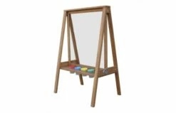 De schildersezel wordt geleverd met een handig canvas van plexiglas. Plexiglas is eenvoudig om schoon te maken. Zo kan je kind bij de volgende schildersessie direct weer aan de slag gaan! De verf kan in de vier gekleurde bakjes – groen, rood, blauw en geel – gegoten worden. Dat ziet er niet alleen leuk uit, maar verkleint ook de kans op het omstoten van potjes verf. Zo blijft alles netjes terwijl je kinderen hun eigen meesterwerk creëren! Aan de andere zijde van de ezel is voldoende ruimte om ander tekengerei neer te leggen, zodat er aan twee kanten tegelijk gespeeld kan worden.