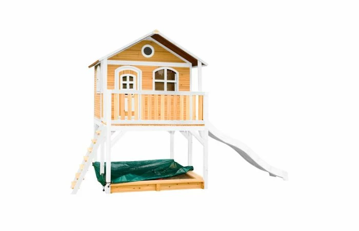 Marc Speelhuis Bruin/wit van AXI heeft echt alles wat je kinderen maar wensen kunnen! Een trap om in het huisje te klimmen en vervolgens van de lange glijbaan naar beneden te roetsjen. En dan zijn ze nog niet uitgespeeld, want onder het speelhuis is ook nog een zandbak waar ze met z’n allen zandtaartjes kunt bakken. In dit speelhuis kunnen ze elkaar de mooiste geheimen vertellen. Zodra ze de ramen en deur dicht doen, kan niemand ze meer afluisteren! Marc is een veelzijdig houten speelhuis met een halfronde deur en ramen. De deur heeft een brievenbus waar kinderen post doorheen kunnen gooien als ze postbodetje spelen. Het speelhuisje is uitgevoerd in moderne bruin/witte kleuren welke perfect in iedere hedendaagse tuin passen. Marc speelhuis heeft een platformhoogte van 118 cm en is uitgevoerd met een grote glijbaan van 228 cm lang. Het trapje en glijbaan kunnen zowel links als rechts aan het speelhuis worden bevestigd. Als de kinderen zijn uitgespeeld kan de zandbak eenvoudig worden afgedekt met de meegeleverde afdekhoes.