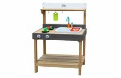 In een handomdraai kan de witte bak met kraan verwijderd worden en blijft er een “Modderkeuken” over. Ideaal als het mooi weer is, want dan kunnen de kinderen heerlijk buitenspelen. Als kind is het een feest om met zand en water te kunnen spelen, dus vul snel de bak met zand en laat ze ontdekken wat er allemaal gemaakt kan worden. Een beslag is zo klaar om heerlijke zandcakejes of moddertaarten te maken. De Rosa Zand & Water Speelkeuken is zo veelzijdig dat kinderen zich hier uren mee kunnen vermaken. Wanneer ze klaar zijn met spelen kan de blauwe bak gemakkelijk uitgenomen worden zodat het schoonmaken nog makkelijker wordt. De plank en opbergruimte onder het aanrecht bieden voldoende ruimte om ander keukenmateriaal, kruidenpotjes of speelgoed op te slaan.
