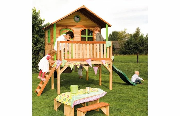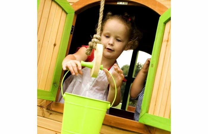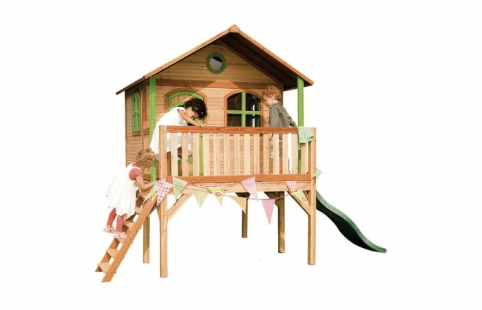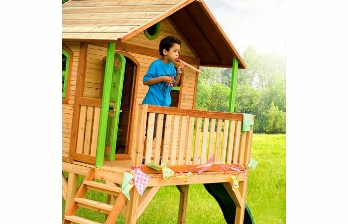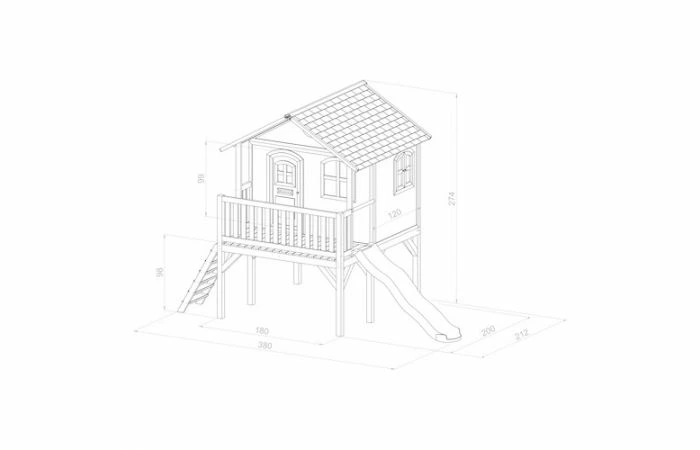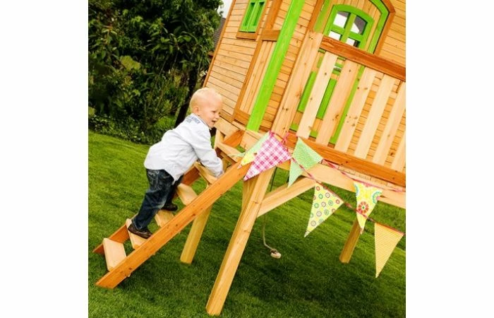 Specificaties houten speelhuisje Sophie- 200 x 377 x 274 cm- Cederhouten planken van 15 mm- Framewerk van 38 mm – 100% FSC houtsoort- Aziatisch cederhout, genaamd Cunninghemia lanceolata.