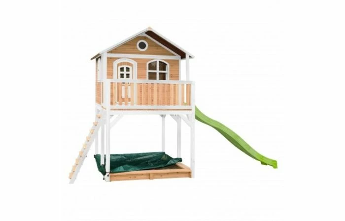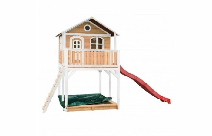 Voor de echte waaghalsjes heeft AXI nu het Andy Speelhuis Bruin/wit, een speelhuis op een platformhoogte van maar liefst 148 cm! Houden jouw kinderen van een mooi uitzicht, klimmen of glijden? Dan is Andy het speelhuis voor jouw kinderen. Ze kunnen via de trap naar boven klimmen om via de veranda hun eigen huisje in te gaan. Als boven klaar zijn kunnen ze snel via de extra lange glijbaan van 290cm naar beneden glijden. En dan zijn ze nog niet uitgespeeld, want onder het speelhuis is ook nog een zandbak waar ze met z’n allen zandkastelen kunnen maken. In dit speelhuis kunnen ze heerlijk genieten van het uitzicht en elkaar de mooiste verhalen vertellen. Zodra ze de ramen en deur dicht doen, kan niemand ze meer afluisteren! Andy is een veelzijdig houten speelhuis met een halfronde deur en ramen. De deur heeft een brievenbus waar kinderen post doorheen kunnen gooien als ze postbodetje spelen. Het speelhuisje is uitgevoerd in moderne bruin/witte kleuren welke perfect in iedere hedendaagse tuin passen. Het trapje en glijbaan van Andy speelhuis kunnen zowel links als rechts aan het speelhuis worden bevestigd. Als de kinderen zijn uitgespeeld kan de zandbak eenvoudig worden afgedekt met de meegeleverde afdekhoes.