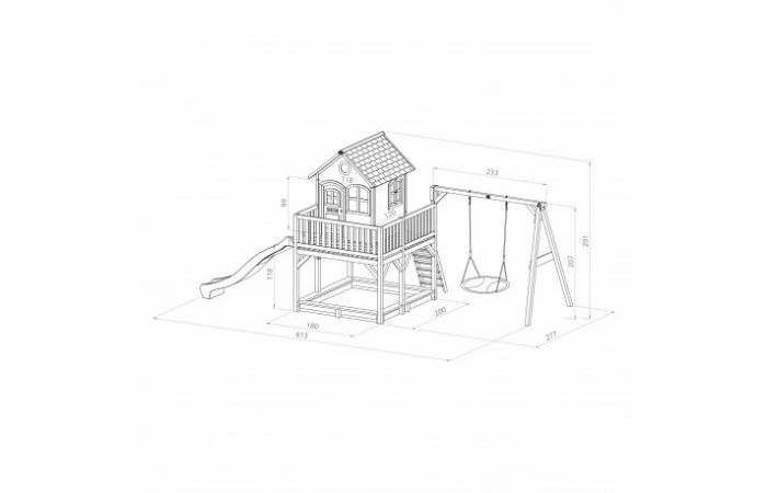 Via de trap kunnen ze omhoog klimmen om het huisje in te gaan en vervolgens van de lange glijbaan naar beneden roetsjen. En dan zijn ze nog niet uitgespeeld, want onder het speelhuis is ook nog een zandbak waar ze met z’n allen zandtaartjes kunt bakken. In dit speelhuis kunnen ze elkaar de mooiste geheimen vertellen. Zodra ze de ramen en deur dicht doen, kan niemand ze meer afluisteren! Liam is een veelzijdig houten speelhuis met een halfronde deur en ramen. De deur heeft een brievenbus waar kinderen post doorheen kunnen gooien als ze postbodetje spelen. Het speelhuisje is uitgevoerd in moderne bruin/witte kleuren welke perfect in iedere hedendaagse tuin passen. Liam speelhuis heeft een platformhoogte van 118 cm en is uitgevoerd met een grote glijbaan van 228 cm lang. Als de kinderen zijn uitgespeeld kan de zandbak eenvoudig worden afgedekt met de meegeleverde afdekhoes.