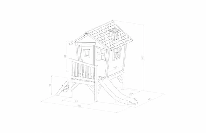 Speelhuis Robin heeft een platformhoogte van 58 cm en een totale hoogte van 203 cm. Het speelhuis is 177 cm lang en 264 cm breed. Vanwege het schuine ontwerp heeft dit speelhuis een afwijkende binnenmaat. Zo is de vloerbreedte 91 cm, maximale breedte 111 cm en de lengte 104 cm. Met een nokhoogte van ca. 140 cm is Robin een middelgroot houten speelhuis.