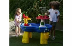 De AquaPlay watertafel is compatibel met Gardena-aansluiting voor het vullen en heeft een plug voor eenvoudig legen. De tafel is zeer stabiel en gemakkelijk te verplaatsen, wat het handig maakt voor kinderen om te spelen waar ze maar willen. In de tuin of op het terras, alles is mogelijk. De tafel in leuk ontwerp heeft een paddenstoel met een waterval- en splashfunctie. Er is ook een pompsysteem met groot handvat. De watertafel wordt geleverd met wat extra accessoires zoals gieter, emmer en pollepel, 2 zeilboten en 2 figgurtjes. Bijgeleverde clips kunnen eenvoudig aan het bord van de tafel worden gehaakt om de accessoires op te hangen.