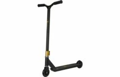 Rule the skatepark op je Black Dragon Vert Racer stuntstep! Deze Black Dragon Stunt Scooter heeft een extra sterke rechthoekige frameconstructie met triple stangklem en is gemaakt van aluminium en heavy duty staal. De ultrasterke en uitermate lichte constructie maakt het oefenen van alle mogelijke trucs heel plezierig. Deze stuntstep vangt alle krachten op terwijl jij je uitslooft in het skatepark. De rubberen handgrepen zijn aan de uiteinden voorzien van stootbescherming en er is een stevige, metalen voetrem op het achterwiel. De step is niet opvouwbaar, maar met de metallic bronzen detailelementen gecombineerd met het zwarte frame zal je zeker opvallen!