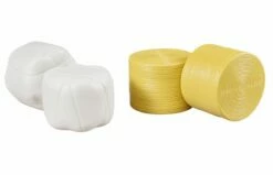 Deze set bestaat uit: 4 ronde hooibalen. 2 gewikkeld in plastic zo dat het gras goed geconserveerd blijft. 2 rond hooibalen met gedroogd gras of stro.