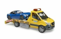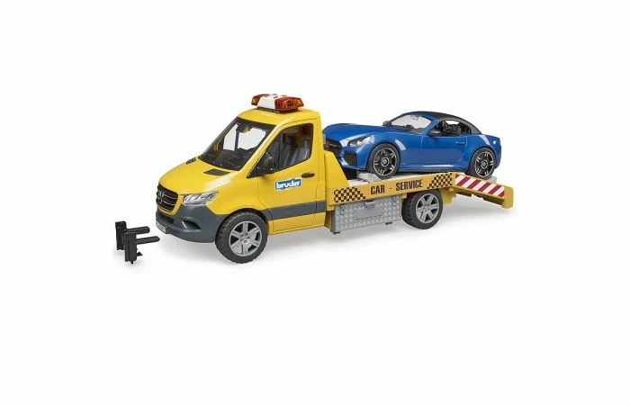 Bruder 2675 Mercedes Benz Sprinter autotransporter met Roadster. Met de kabellier kunnen voertuigen in nood zelfs uit de moeilijkste situaties worden bevrijd. De meegeleverde BRUDER Roadster heeft een afneembaar dak en biedt plaats aan elk Bruder figuur.