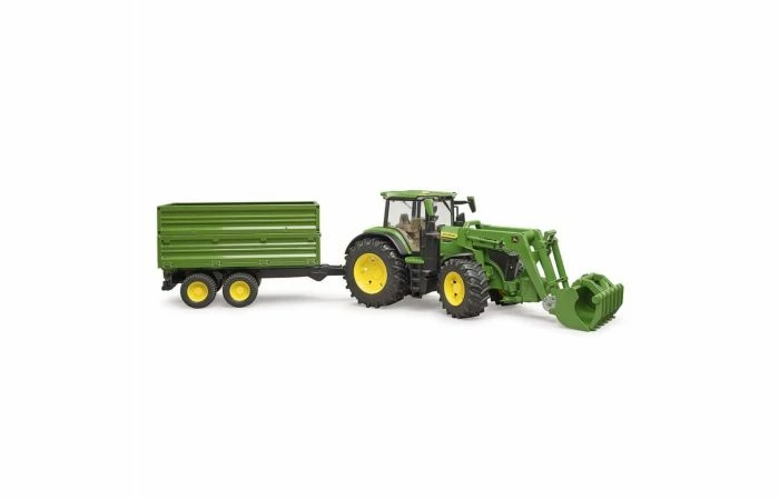 Bruder Tractor John Deere 7R 350 met voorlader en kiepaanhanger. De tractor is uitgerust met veel realistische details. De motorkap gaat open en onthult de imposante motor. Deuren kunnen geopend worden en bieden plaats aan de optioneel verkrijgbare bworld figuren in een moderne cabine. Kenmerkend voor BRUDER is de uitstekende bestuurbaarheid en het rijcomfort door de ingebouwde pendelas en de stuurverlenging die door het schuifdak kan worden gebruikt. Voor nog meer speelplezier kan de voorlader worden ingebouwd.