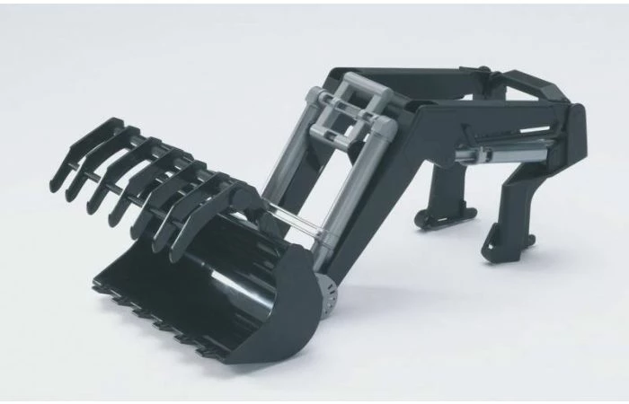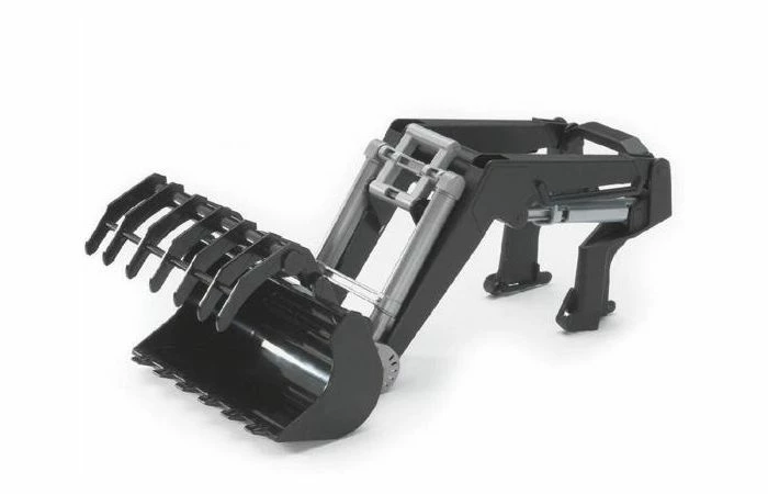 Deze Bruder frontlader kan bevestigd worden zonder het gewicht aan de voorkant te verwijderen. De grijper kan ook afzonderlijk verwijderd worden.