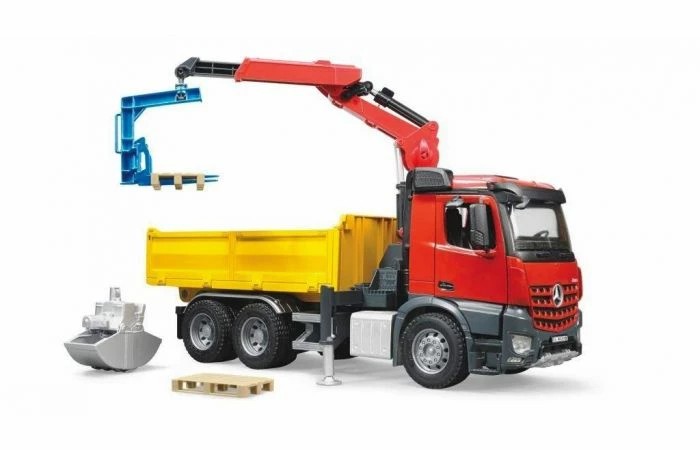 Deze Bruder Mercedes-Benz Arocs vrachtwagen is superhandig! De zijkanten en de achterkant van de laadbak kunnen open en er zit een kraan aan die je zelf kunt besturen. Als je gaat rijden, kun je die stevig vastzetten met de vergrendeling. Pak de spullen op met de kraan en leg ze in je laadbak, of haal ze er juist uit. Je kunt natuurlijk ook gewoon de achterklep opendoen en de laadklep naar beneden kantelen om hem te legen. Aan de kraan kan je verschillende hulpmiddelen bevestigen. Als je meer stabiliteit nodig hebt tijdens het laden of lossen, kun je de steunpoten uitvouwen.
