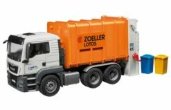 Met deze MAN vuilniswagen van Bruder haal je het vuilnis in je stad op. Je kunt het natuurlijk niet zomaar op straat laten liggen! Leeg de vuilnisbakken en gooi de vuilniszakken in de wagen zodat het vuil vermalen wordt. Rijd door de stad om geen vuil te missen. Aan het einde van de rit is je stad weer netjes op orde. Rijd naar de vuilnisbelt en dump het vuil door de bak te kiepen.