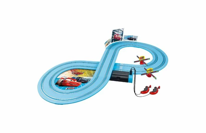 Carrera First racebaan met de helden van Disney Pixar Cars. Rijd met Lightning McQueen en Jackson Storm over de 2,4 meter lange racebaan. Je kunt vol gas door de bochten: de auto’s kunnen er bijna niet uitvliegen! Bedien eenvoudig de autootjes met de speciaal ontworpen handbediening voor kleine kinderhandjes. De racebaan bevat twee tolpoortjes voor extra speelplezier. Inhoud: 2 voertuigen en ergonomische handbediening. Baanlengte: 2,4 meter. Afmetingen: 93 x 45 cm. De racebaan werkt op 4 type C batterijen (niet inbegrepen). Geschikt voor kinderen vanaf 3 jaar.