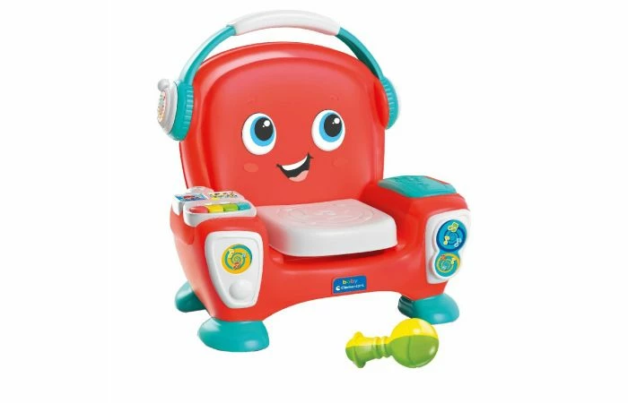 Een interactieve leunstoel met meerdere muzikale activiteiten! Hij zit boordevol muziekinstrumenten en is uitgerust met een sambabal, een drumstok, een keyboard, een miniconsole met aanraaktoetsen en een lichtgevend scherm. De speciale sensor van de stoel detecteert als het kind gaat zitten en biedt leuke muziek en interactieve dansen, waardoor het kind wordt uitgenodigd te bewegen tijdens het spelen. De Dans-functie suggereert interactieve liedjes, zoals de stoelendans, waarbij het kind moet opstaan, rond de stoel dansen en gaan zitten voor het aftellen stopt. De Speel-functie begeleidt het kind bij het bespelen van het keyboard aan de hand van de kleuren van de toetsen, voor een eerste kennismaking met muziek. Als er met de Zing-functie wordt gespeeld, wordt het kind uitgenodigd met de stoel een liedje te zingen, wat het brabbelen stimuleert. De Relax-functie zorgt voor veel knuffels en lieve melodietjes. Wordt exclusief 2 AAA-batterijen geleverd.