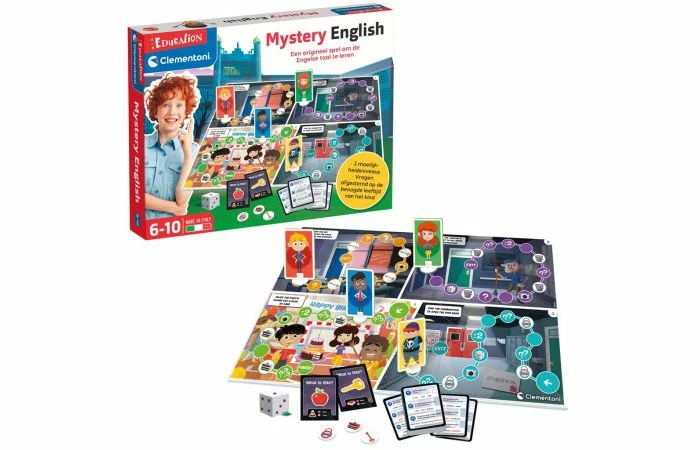 Clementoni Ik leer Engels. Een origineel en mysterieus bordspel om op een eenvoudige en leuke manier Engels te leren! Beantwoord de vragen, verzamel alle voorwerpen om uit de ruimtes te komen, versla je tegenstanders en arriveer als eerste op het feest! Nog meer plezier met de educatieve app, ontwikkeld in samenwerking met het British Institute. Geschikt voor kinderen vanaf 4 jaar.