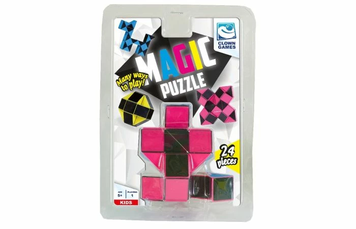De Clown Magic Puzzle is verkrijgbaar in de kleuren geel, groen, roze en blauw en bestaat uit 24 draaibare elementen.