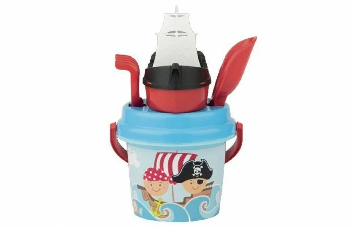 Deze 5–delige emmerset is uitgevoerd in leuk Pirate Adventures design. De set bestaat uit een emmer met hengsel en heeft een doorsnede van 13 cm. Tevens wordt de set geleverd met leuke accessoires; een harkje, een schepje, een bootje en een zeef.