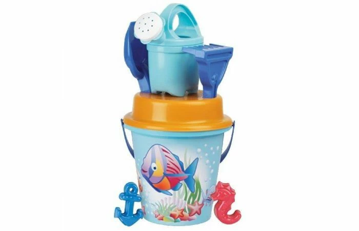 Deze 7–delige speelgoed emmerset is uitgevoerd in leuk Crazy Fish design. De setbestaat uit een emmer met hengsel en heeft een doorsnede van 17 cm. Tevens wordt de set geleverd met leuke accessoires; een gieter met sproeikop, een harkje, eenschepje, 2 zandvormpjes en een zeef.