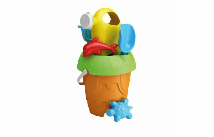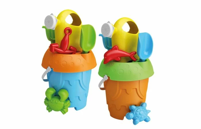 Zeven-delige strandset in de frisse kleuren oranje, groen, blauw, rood en geel. Hiermee kun je de mooiste zandkastelen bouwen! De strandset bestaat uit een kasteel-emmer met hengsel, zeef, gieter, harkje, schepje en twee zandvompjes. De emmer heeft een hoogte van 16 cm. Wordt in twee uitvoeringen met verschillende samenstelling geleverd in net. Geschikt voor kinderen vanaf 1 jaar.