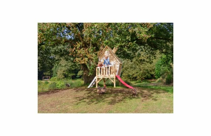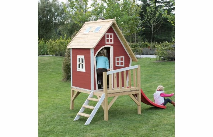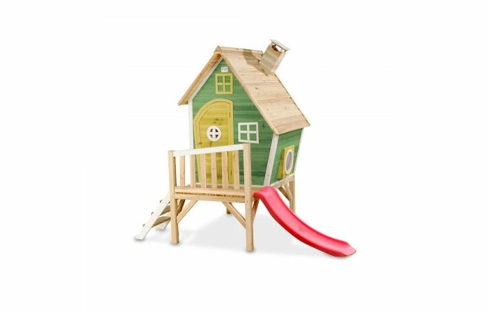 In het EXIT Fantasia 300 houten speelhuis voelt ieder kind zich thuis. Je wordt al vrolijk door alleen naar de speelhuisjes te kijken. Dit speelse EXIT Fantasia huisje staat op poten en heeft een leuke glijbaan. Het houten speelhuisje is eenvoudig in elkaar te zetten met de vooraf gemonteerde panelen. Details zoals een schoorsteen, speels gevormde raampjes en een scheve balustrade maken het EXIT Fantasia 300 houten speelhuisje helemaal af!