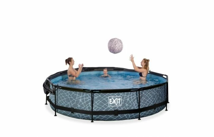 Ontdek hoe stevig een rond opzetzwembad kan zijn: het gepoedercoate stalen frame en de sterke poten van het EXIT Stone zwembad zorgen ervoor dat het bad altijd stabiel staat en jarenlang meegaat. De meegeleverde filterpomp houdt het water schoon en in beweging zodat vervuiling van het water wordt tegengegaan. In het EXIT Stone zwembad neem je altijd een frisse duik!