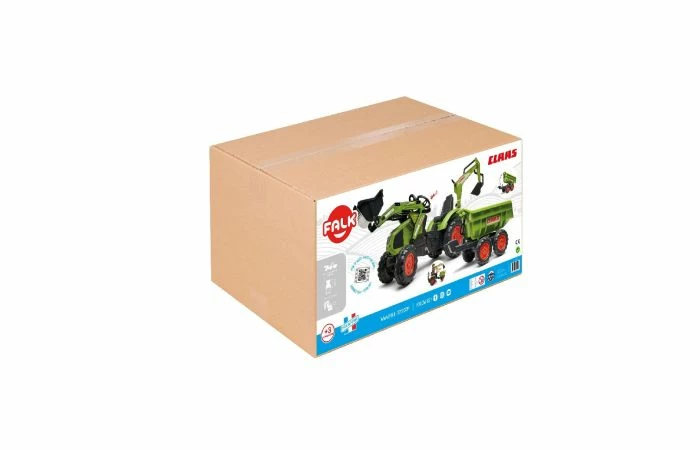 Deze Falk Claas Axos groene traptractor is uitgevoerd in origineel Claas design, heeft een totale lengte van 225 cm en wordt geleverd inclusief aanhanger. Het is een mooie traptractor van een robuuste kwaliteit, met kunststof wielen die zeer slijtvast zijn en het stuur bevat een toeter met geluidsfunctie. De tractor heeft naast een aanhanger aan de achterkant ook nog een shovel aan de voorzijde. De shovel kan door middel van de beweegbare laadarm in verschillende standen worden gezet. Tevens zit er aan de achterzijde ook nog een een graafarm die handmatig te bedienen is. De aanhanger is makkelijk te koppelen en te ontkoppelen: zo kan er van alles vervoerd worden! Maximaal draaggewicht: 50 kg. Geschikt voor kinderen vanaf 3 jaar.