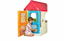 Feber Gyro huis is een speelhuis inclusief draaideur, met 6 verschillende speelplekken: keuken, barbecue (inclusief gootsteen), tuin (met plantenbak), automaat, school (met whiteboard) en supermarkt. Stevig, eenvoudig te monteren en met anti-UV systeem (voor minder kleurverlies en betere weerstand). Kleuren: rood, zand, groen, blauw en oranje. Productafmetingen: 85 x 166 x 124 cm. Voor kinderen vanaf 2 jaar.