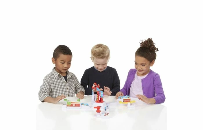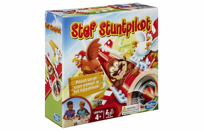 Stef stunt en stuitert en duikt maar raak. Hij vliegt steeds langs jouw kippenhok. Kun jij jouw kippen beschermen tegen Stef en zijn stuiterende stuntvliegtuig? Voor 2 – 4 spelers vanaf 4 jaar.
