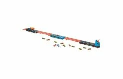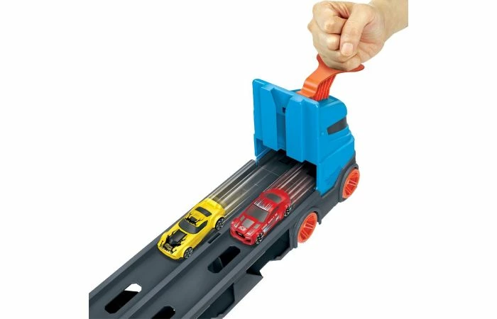 De Hot Wheels Racebaanlanceerder biedt een heel nieuwe manier om met je Hot Wheels auto’s te spelen en ze op te bergen, allemaal in één supercoole semi-vrachtwagen vol verrassingen. Kleine etalages op de trailer laten de meer dan 20 Hot Wheels auto’s zien die hij kan dragen. Als kinderen aan de achtervergrendeling trekken, ontvouwt de vrachtwagen zich tot een 180 cm lang circuit! Ongebruikte auto’s blijven zichtbaar onder het circuit, terwijl de cabine van de vrachtwagen verandert in een dubbele lanceerder die twee auto’s lanceert voor een epische nek-aan-nek-strijd. De winnaar gaat verder op het volgende avontuur met circuits die verbinding maken met andere Hot Wheels City-sets (apart verkrijgbaar). Het multifunctionele voertuig wordt geleverd met drie Hot Wheels voertuigen met een schaal van 1:64 en biedt opbergruimte voor nog eens 20 extra voertuigen (apart verkrijgbaar). Geschikt voor kinderen van 4 tot 8 jaar.