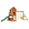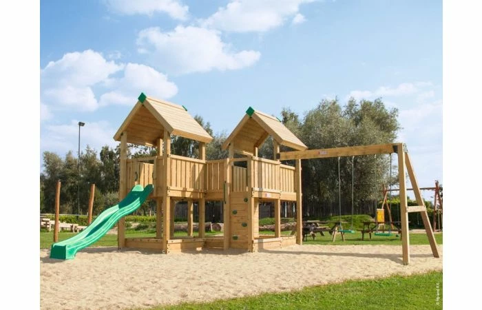 Gecertificeerd voor commercieel gebruik, het ideale houten speelhuis met schommelaanbouw voor scholen, een kleine kinderopvang of vakantiepark.