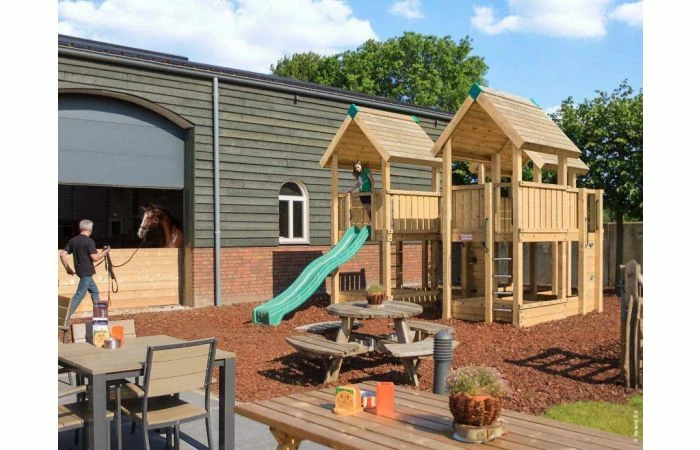 Gecertificeerd voor commercieel gebruik en compact, het ideale houten speelhuis voor scholen, sportcomplex, kinderopvang of vakantiepark.