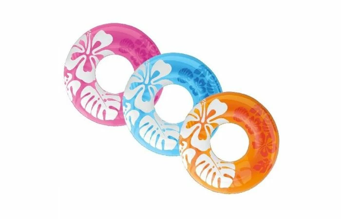 Transparante tube met bloemdessin in 3 kleuren met een doorsnede van 91 cm. Vervaardigd van zware kwaliteit vinyl en voorzien van veiligheidsventiel. Wordt geleverd in doosje. Ftalaten-vrij!