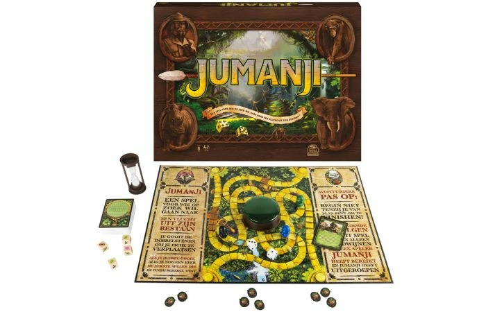 Jumanji Het Spel. Jij en je groep dappere avonturiers bevinden zich plotseling diep in een mysterieuze jungle vol geheimen en verrassingen. Het gevaar ligt langs je pad en dreigt je 3 kostbare levensfiches weg te pakken. Je doel is om Jumanji (het centrum) te bereiken en de naam ervan te roepen, maar pas op: als één van je groepen geen levensfiches meer heeft, verliest iedereen! Gooi bij elke beurt met de dobbelstenen en verplaats je langs het pad en gebruik de Groene Koepel om een raadsel te onthullen. Los het raadsel goed op en verplaats een extra vakje. Beëindig je beurt door een uitdagingskaart te trekken om te zien welke moeilijkheden Jumanji voor je in petto heeft. Bereik het centrum met minstens één levensfiche per speler over en roep Jumanji! Geschikt voor 2 tot 4 spelers vanaf 8 jaar.
