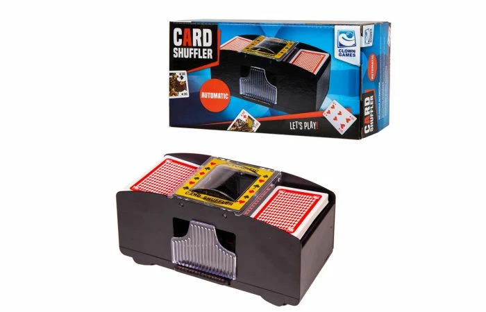 Automatische kaartenschudmachine van Clown Games. Dankzij dit handige apparaatje is schudden met de hand verleden tijd. Dit scheelt moeite, maar voorkomt ook discussie over of de kaarten wel goed geschud zijn! Leg de kaarten op beide zijden van het apparaat, druk op de knop en laat de machine z’n gang gaan. De geschudde kaarten komen onderin het bakje te liggen.