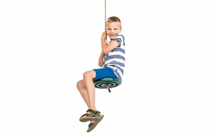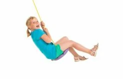 De schommel heeft een zeer comfortabel zitoppervlak in de vorm van een bloem. Het lila zitje wordt geleverd met een geel PP-touw en heeft lila lassen. Dit leuke detail geeft het net wat meer cachet.