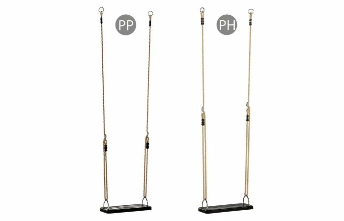 PP-touw: Vervaardigd uit continue polypropyleenvezels. Dit touw heeft een gladde textuur, en zeer goede glijeigenschappen. De standaard kleur is beige. PH-touw: Vervaardigd uit korte gespannen kunststofvezels, is weerbestendig, esthetisch en handvriendelijk. Ongetwijfeld de beste touwsoort voor alle schommels. De standaard kleur is beige.