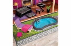 De twee buitenruimtes, een dakterras en een uitgebouwde patio met een zwembad zorgen dat er van alles is om te ontdekken. Bovendien heeft dit poppenhuis een daktrap, een schuiflift die de drie verdiepingen met elkaar verbindt en een heus dakraam.
