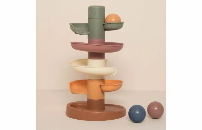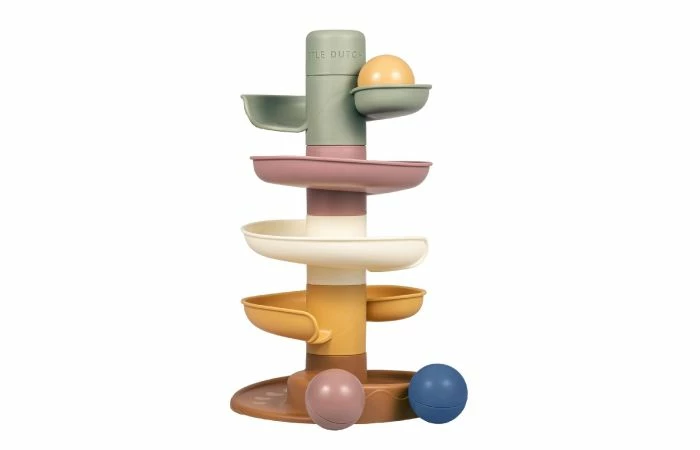 Laat de bal maar rollen! De spiraaltoren van Little Dutch zorgt voor eindeloos veel speelplezier. Deze kleurrijke set bestaat uit 5 herkenbare vintage gekleurde delen die jouw kleintje gemakkelijk op elkaar stapelt. Laat de ballen één voor één op de bovenste laag vallen en kijk hoe ze achter elkaar naar beneden rollen en slingeren. De spiraaltoren draagt bij aan de ontwikkeling van de hand-oog coördinatie en leert kleintjes over oorzaak en gevolg, waarmee het zowel leuk als leerzaam spelen is. Bij de spiraaltoren zitten standaard 3 lichte en gemakkelijk vast te pakken ballen in verschillende kleuren die bij beweging een geluidje maken. Dit speelgoed is uitgevoerd in de super trendy Little Dutch retro kleuren. De afmeting is: 18 x 18 x 30 cm. Geschikt voor kinderen vanaf 18 maanden.