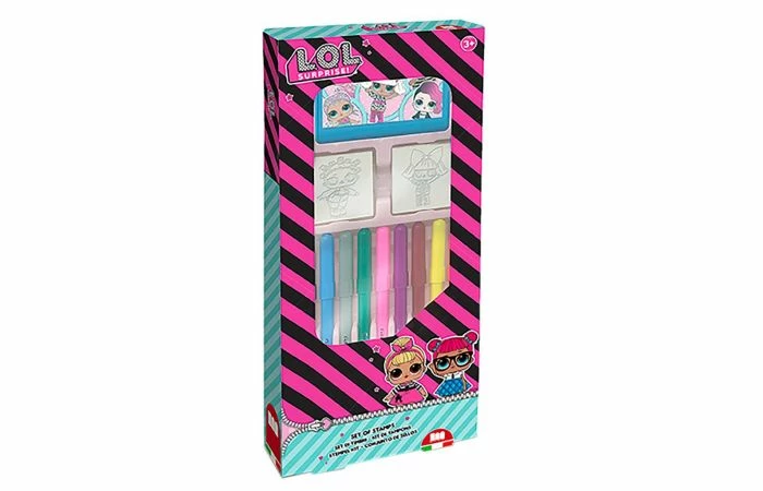 LOL kleurset met stempels, 12-delig. Maak de mooiste creaties met jouw vriendjes Diva, Rocker en Merbaby! Deze leuke set bestaat uit 9 stiften, 2 stempels en een boekje. Wordt geleverd in windowbox. Geschikt voor kinderen vanaf 3 jaar.