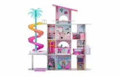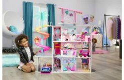 Dit LOL Surprise OMG huis vol verrassingen is 122 cm hoog en 122 cm breed en heeft 4 verdiepingen en 10 kamers, waaronder een slaapkamer, badkamer, volledig ingerichte keuken, woonkamer, zwembad, dakterras, bioscoop, restaurant en meer. Elk van de 10 volledig ingerichte kamers is geschikt voor alle OMG-modepoppen en LOL Surprise-poppen! Laat jouw modepoppen in dit huis een glamourleven leiden zoals nooit tevoren! Geniet van de interactieve lampjes van de vuurkuil op het dakterras en check de echt werkende lift en de afwasmachine in de keuken. Met een spiraalglijbaan en een echt werkende lift waarin 2-3 poppen passen, hebben je LOL Surprise-poppen en OMG-modepoppen nu toegang tot elke verdieping van dit poppenhuis van 4 verdiepingen. Bovendien kunnen de meubels transformeren en draaien de kamers om extra functies te onthullen! Giet water in het zwembad en geniet van de zomerse warmte. Het huis beschikt ook over een drive-inoptie en een garage. Wordt inclusief 3 knoopcelbatterijen geleverd in full-colour doos.