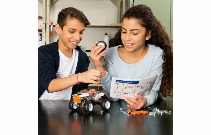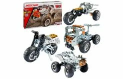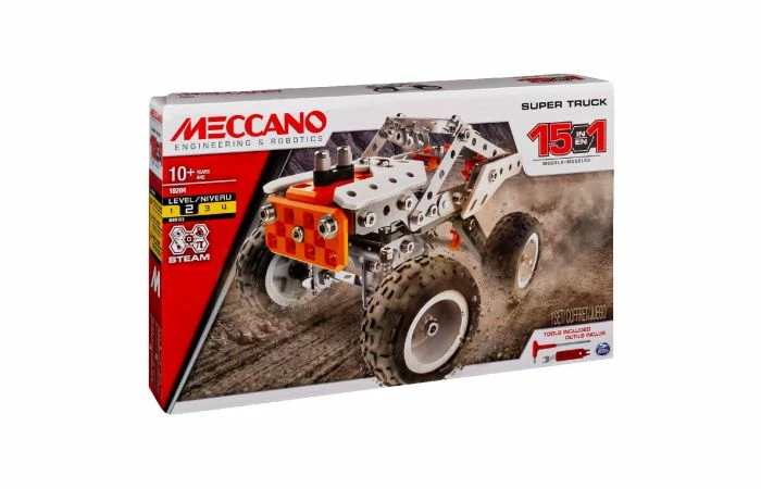 Ontdek de wereld van echte techniek met de Meccano 15-in-1 Super Truck Set! Met deze bouwset monteer je één van de 15 verschillende voertuigmodellen, waaronder een tweepersoons-ATV met verstelbaar stuur en werkende voor- en achtervering! Haal hem vervolgens uit elkaar en bouw een compleet nieuw model! Werkend aan deze S.T.E.A.M.-bouwset, brengen kids de concepten uit de wetenschappen, technologie, engineering, kunst en wiskunde in de praktijk. Bouwers vinden in deze set alles wat ze nodig hebben om coole auto’s te bouwen: handige gereedschappen, werkende wielen, echte metalen moeren en bouten en een gemakkelijk te begrijpen instructiegids. Maak eerst de drie modellen in de instructies of gebruik je fantasie om je eigen voertuig te maken. Laat je gaan met de Meccano 15-in-1 Super Truck Set! Geschikt voor kinderen vanaf 10 jaar.