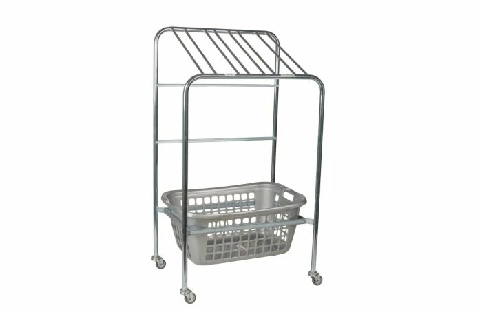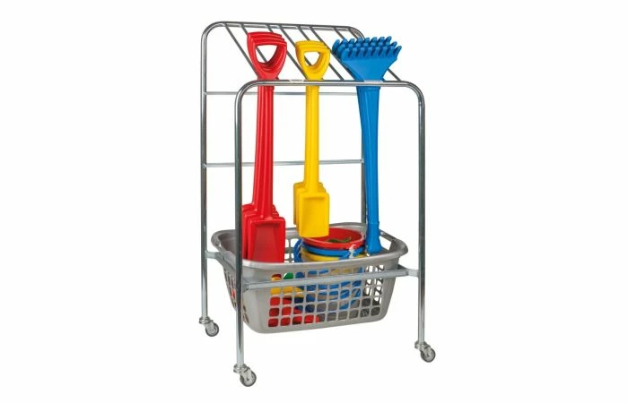 Het scheppenrek is vervaardigd van gegalvaniseerd buismateriaal met 4 zware zwenkwielen. Onderin past de op de afbeelding getoonde plastic opbergmand.