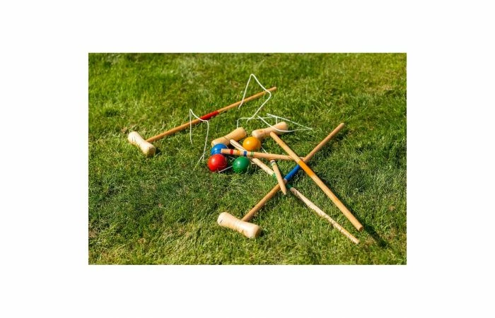 - Inhoud: 4 croquet hamertjes van 75 cm, 4 ballen van 7,3 cm doorsnee, 2 houten stokken en 10 metalen poortjes.