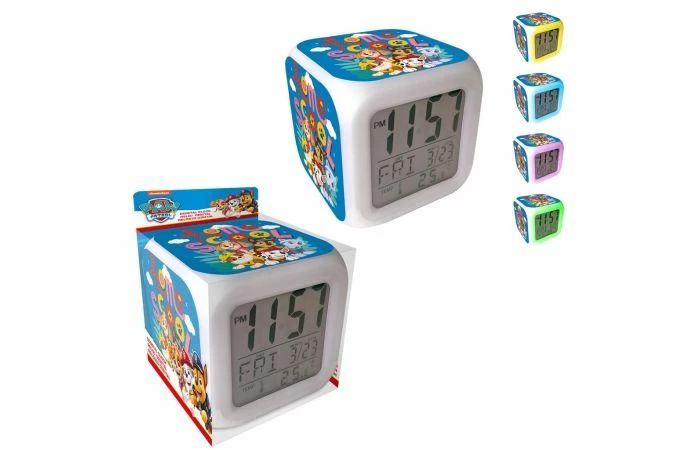 De klok kan in verschillende kleuren veranderen: geel, blauw, roze en groen. Ook laat hij je de juiste dag, datum en temperatuur zien. Wordt exclusief 3 AAA-batterijen geleverd in windowbox. Geschikt voor kinderen vanaf 3 jaar.