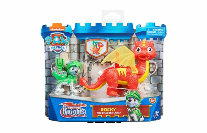 Ga mee met je favoriete pups en hun nieuwe drakenvriendjes, en beleef spannende reddingsmissies met de Rescue Knights Pup en Draak-sets. Deze set actiefiguren bevat Rocky en zijn trouwe drakenvriendje Flame. De geliefde pup van Paw Patrol draagt zijn Rescue Knights-harnas en is klaar om in actie te komen. Druk op de badgeknop van Rocky om het gereedschap in zijn rugzak te transformeren en open te klappen. Klem Rocky vervolgens op de rug van Flame en druk op de knop op de staart om de glinsterende, doorzichtige vleugels te laten bewegen. Deze geweldige set brengt al het middeleeuwse plezier van de populaire tv-serie tot leven. Verzamel alle Rescue Knights Pup en Draak-sets en gebruik je fantasie om keer op keer je eigen reddingsmissies te verzinnen. Inhoud: 1 Paw Patrol-figuur, 1 draakfiguur. Wordt geleverd in touchbox. Geschikt voor kinderen vanaf 3 jaar.